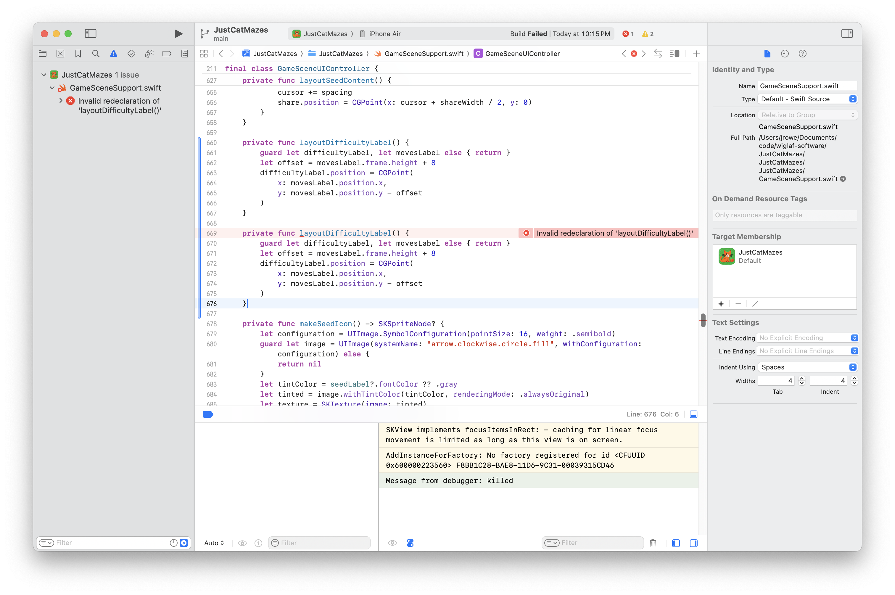 AI seems to have no qualms adding duplicate named functions. You can see in this example that a second layoutDifficultyLable() function has been added, resulting in a compiler error.
